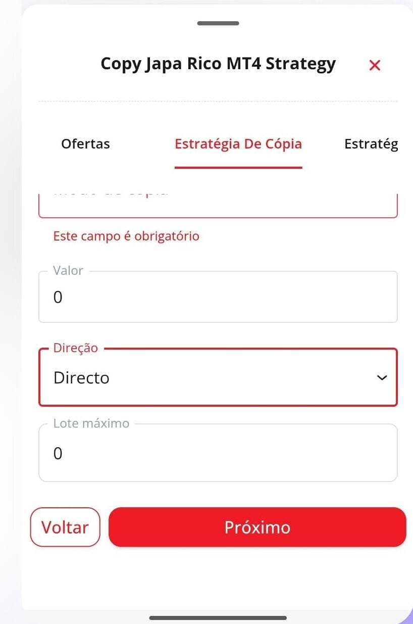 Answer: As the Copy Trade configuration is "equity proportion", the system automatically adjusts to the size of your account. That said, the vast majority of clients start with at least 1000 (thousand) USD in the account. The minimum acceptable value by the system to enter the copy trade is 1000 USD. Also remember that you must deposit this amount with Doo Prime broker and when the amount enters, it will be inside your Wallet at Doo Prime. You should then transfer this amount from your wallet to the MT4 ECN account you created. After that, you can enter Japa Rico's copy trade. Remember to do this, because if you don't, the system does not authorize copy trade if your MT4 ECN account has no value in it.